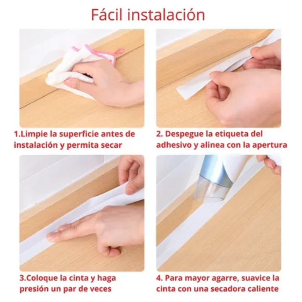 4. En primer lugar, retire la cinta adhesiva en la parte posterior del producto y dóblela a 90 grados, y luego fije la tira impermeable en la superficie a pegar; continúe despegando la cinta adhesiva hasta que se completen todas las instalaciones;